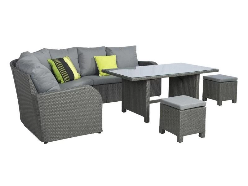 De 4-delige Bandung hoek-lounge-diningset is gemaakt van een aluminium frame met daar omheen een 6 mm halfrond vlechtwerkdraad in de kleur kooboo. De set wordt geleverd inclusief kussens, in de kleur mouse grey.Deze lounge-diningset met een totale afmeting van 200 x 255 x H84 cm bestaat uit twee bankelementen, één klein en de ander groot. Set is voorzien van een trapeze hoek, zodat je ook in de hoek kunt zitten. De set wordt geleverd met een loungetafel van 150 x 90 x H67 cm. De loungetafel heeft een onderhoudsvrije glasplaat.