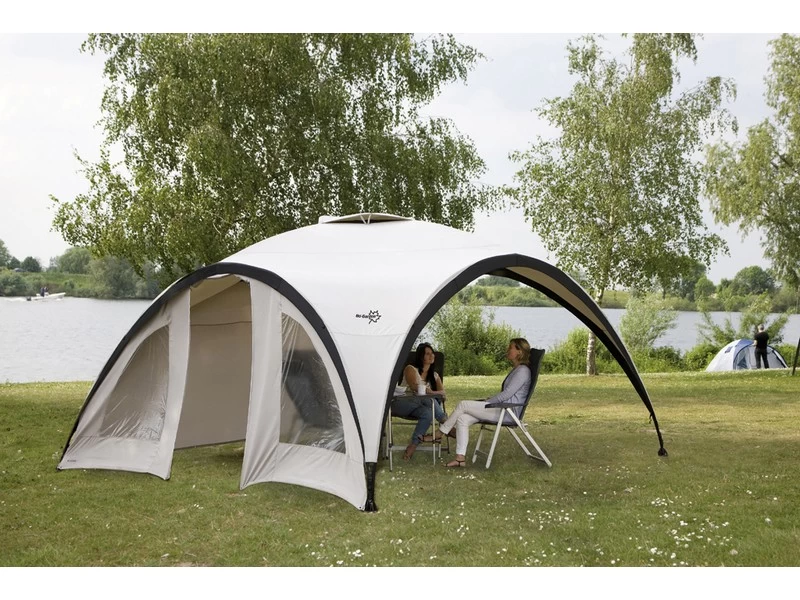 Een extra ruime party shelter. Ideaal voor activiteiten en evenementen buitenshuis. Deze partyshelter heeft een zeer solide tentdoek van 160 gr/m² polyester. Dit doek is waterdicht (waterkolom 1500 mm), UV-bestendig, vlamvertragend en voorzien van ventilatie aan de bovenkant. De sterke stalen boogstokken en de stabiele voetjes zorgen dat deze shelter extra stevig en stabiel staat, zelfs op drassige ondergronden. De shelter is eenvoudig op te zetten en uit te breiden met diverse zijwanden die worden bevestigd door middel van klittenband. Wordt compleet geleverd met scheerlijnen, haringen en een transporthoes.