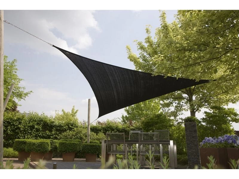Een lichtdoorlatend driehoekig schaduwdoek. Dit UV-bestendige doek beschermt tegen de hitte van de zon en verminderd de kans op verbranden. Door middel van de stevige afspanogen is dit schaduwdoek eenvoudig en naar wens te bevestigen. Een hoge kwaliteit schaduwdoek gemaakt van 180 gr/m² ‘high density polyethyleen’ (HDPE). Inclusief handige draagtas (exclusief tarpstokken).