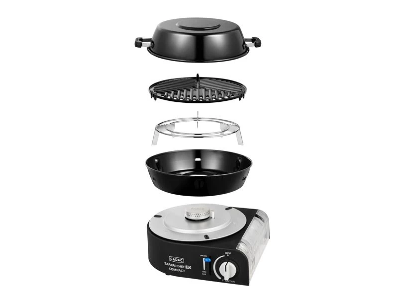 De nieuwe Safari Chef 30 Compact is een ultra compacte, lichtgewicht gasbarbecue. Deze BBQ werkt rechtstreeks op een 227gr gasblikje; plaats de gascartridge in het toestel, klik hem vast en je kunt gelijk beginnen met koken of barbecueën. Een ideaal toestel tijdens outdoor activiteiten en kampeervakanties. Ondanks zijn kleine formaat is de Safari Chef Compact Lite uiterst veelzijdig dankzij de drie meegeleverde kookoppervlakken; een pandrager, een BBQ rooster en een deksel/pan. Op de pandrager kook je eenvoudig een pannetje soep of pasta. Het BBQ rooster is voorzien van CADAC’s GreenGrill coating en is perfect voor het bakken en grillen van vlees, vis en groentes. De deksel kun je ook gebruiken als (soep)pan en is dus multifunctioneel. De lekbak vangt eventuele kookresten op als je het BBQ rooster gebruikt, maar doet ook dienst als windscherm zodat de brander niet uitwaait. Een stevige draagtas wordt meegeleverd, zodat je de Safari Chef Compact eenvoudig overal mee naartoe neemt.