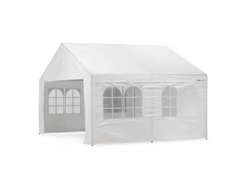 Met een deur aan beide kopse kanten, maar ook geheel af te sluiten met wanden. Ideaal als u een gezelschap heeft tijdens een feestje, barbecue of andere gezellige bijeenkomsten.