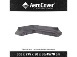 Loungesethoes van AeroCover. Ademende loungesethoes voor loungesets met platform links 350x275x90xH30/45/70. AeroCovers zijn ademend, waterbestendig, reduceren condensvorming en gaan schimmelvorming tegen. Wanneer u in de set zit is de linkerzijde langer dan de rechterzijde.De stof heeft een hoge kleurechtheid dankzij de door en door geverfde vezels. Een AeroCover hoes verlengt de levensduur van uw tuinmeubelen. AeroCovers zijn vervaardigd van sterk en lichtgewicht ripstop polyester. Ze zijn makkelijk hanteerbaar en nemen weinig ruimte in wanneer niet in gebruik. De afdekhoes is voorzien van rijgkoord met 2 stoppers voor een goede pasvorm. Inclusief handige opbergtas. AeroCover stoffen zijn 100% waterdicht, de naden zijn, net als elke ander hoes, spatwaterdicht.