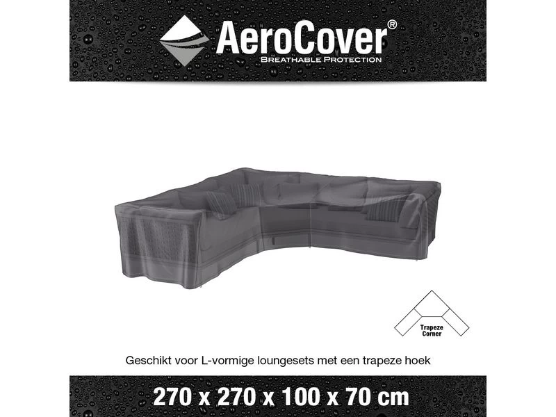 Loungesethoes voor hoeksets van AeroCover. Ademende loungesethoes voor L-vorm loungeset met grote hoek of trapeze hoek 270x270x100x70. AeroCovers zijn ademend, waterbestendig, reduceren condensvorming en gaan schimmelvorming tegen. De stof heeft een hoge kleurechtheid dankzij de door en door geverfde vezels. Een AeroCover hoes verlengt de levensduur van uw tuinmeubelen. AeroCovers zijn vervaardigd van sterk en lichtgewicht ripstop polyester. Ze zijn makkelijk hanteerbaar en nemen weinig ruimte in wanneer niet in gebruik. De afdekhoes is voorzien van rijgkoord met 2 stoppers voor een goede pasvorm. Inclusief handige opbergtas. AeroCover stoffen zijn 100% waterdicht, de naden zijn, net als elke ander hoes, spatwaterdicht.