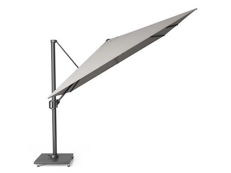 Zweefparasol Challenger T¹ 4×3. Grote zweefparasol van Platinum. Achterwaarts kantelbaar en 360 graden draaibaar. De Challenger T¹ zweefparasol is uitgevoerd met een zware kwaliteit 240 grams spuncrylic doek in Manhattan voorzien van water- en vuilafstotende coating en doekspanners. Dit doek heeft een zeer hoge mate van kleurechtheid is getest in klasse 7 (uitstekend). Gebruik een AeroCover ademende parasolhoes om uw parasol als nieuw te houden. De zweefparasol heeft het grote voordeel dat de paal van de zweefparasol niet zo nadrukkelijk aanwezig is als bij een gewone parasol en wat verder van uw tuinset geplaatst kan worden. Hierdoor kan de gehele ruimte onder de zwevende parasol benut worden. De parasol wordt zonder voet geleverd. Wij adviseren deze parasol op een 120kg parasolvoet van te plaatsen.