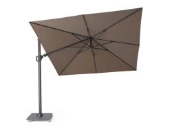 Zweefparasol Challenger T² 3×3 van Platinum. Deze parasol is voorzien van het unieke T2 kantelsysteem met rvs binnenwerk. Hierdoor kunt u uw zweefparasol traploos zijwaarts en achterover kantelen. De parasol is 360 graden draaibaar. Zo kunt u altijd in de schaduw zitten zonder de parasol te verplaatsen! De Challenger T2 zweefparasol is uitgevoerd met een zware kwaliteit 240 grams spuncrylic doek in voorzien van water- en vuilafstotende coating en doekspanners. Dit doek heeft een zeer hoge mate van kleurechtheid is getest in klasse 7 (uitstekend). Gebruik een AeroCover ademende parasolhoes om uw parasol als nieuw te houden. De zweefparasol heeft het grote voordeel dat de paal van de zweefparasol niet zo nadrukkelijk aanwezig is als bij een gewone parasol en wat verder van uw tuinset geplaatst kan worden. Hierdoor kan de gehele ruimte onder de zwevende parasol benut worden. De parasol wordt zonder voet geleverd. Wij adviseren deze parasol op een 90kg parasolvoet van Platinum te plaatsen. Deze zijn met wielen leverbaar zodat de parasol makkelijk te verplaatsen is.