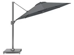 Zweefparasol Voyager T1 Ø3.0 van Platinum. Achterwaarts kantelbaar en 360 graden draaibaar. De Voyager T1 zweefparasol is uitgevoerd met een 220 grams antraciet polyester doek voorzien van water- en vuilafstotende coating. Dit doek heeft een hoge mate van kleurechtheid is getest in klasse 5-6 (goed – zeer goed). Een zweefparasol heeft het grote voordeel dat de paal van de zweefparasol niet zo nadrukkelijk aanwezig is als bij een gewone parasol en wat verder van uw tuinset geplaatst kan worden. Hierdoor kan de gehele ruimte onder de zwevende parasol benut worden. Houd uw parasol als nieuw en dek deze alleen af met een AeroCover ademende parasolhoes wanneer u deze langere tijd niet gebruikt. Granietvoet op foto tegen meerprijs leverbaar. In plaats van deze zweefparasols te verzwaren met tegels kan deze ook rechtstreeks op een 90kg parasolvoet van Platinum geplaatst worden. Deze zijn met wielen leverbaar zodat de parasol makkelijk te verplaatsen is.