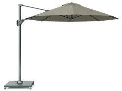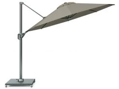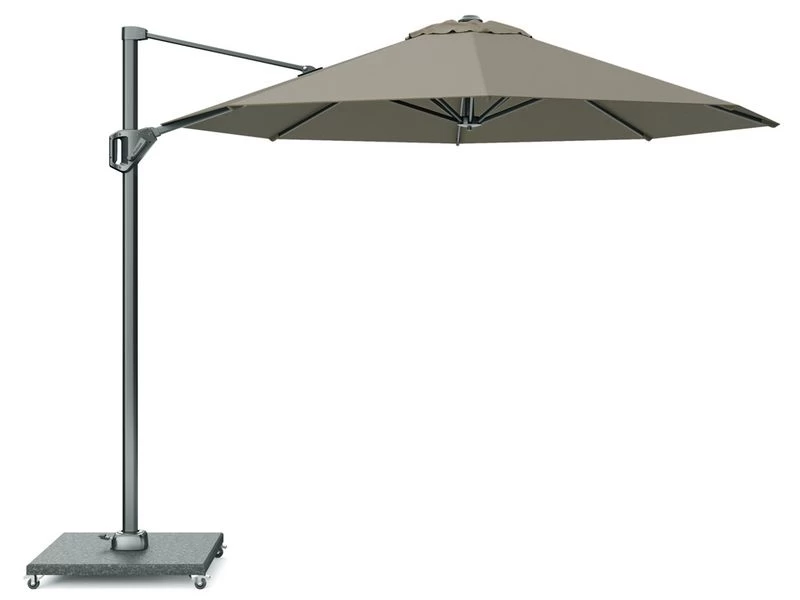 Zweefparasol Voyager T1 Ø3.0 van Platinum. Achterwaarts kantelbaar en 360 graden draaibaar. De Voyager T1 zweefparasol is uitgevoerd met een 220 grams antraciet polyester doek voorzien van water- en vuilafstotende coating. Dit doek heeft een hoge mate van kleurechtheid is getest in klasse 5-6 (goed – zeer goed). Een zweefparasol heeft het grote voordeel dat de paal van de zweefparasol niet zo nadrukkelijk aanwezig is als bij een gewone parasol en wat verder van uw tuinset geplaatst kan worden. Hierdoor kan de gehele ruimte onder de zwevende parasol benut worden. Houd uw parasol als nieuw en dek deze alleen af met een AeroCover ademende parasolhoes wanneer u deze langere tijd niet gebruikt. Granietvoet op foto tegen meerprijs leverbaar. In plaats van deze zweefparasols te verzwaren met tegels kan deze ook rechtstreeks op een 90kg parasolvoet van Platinum geplaatst worden. Deze zijn met wielen leverbaar zodat de parasol makkelijk te verplaatsen is.