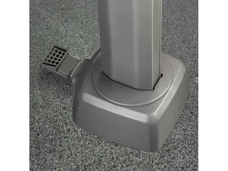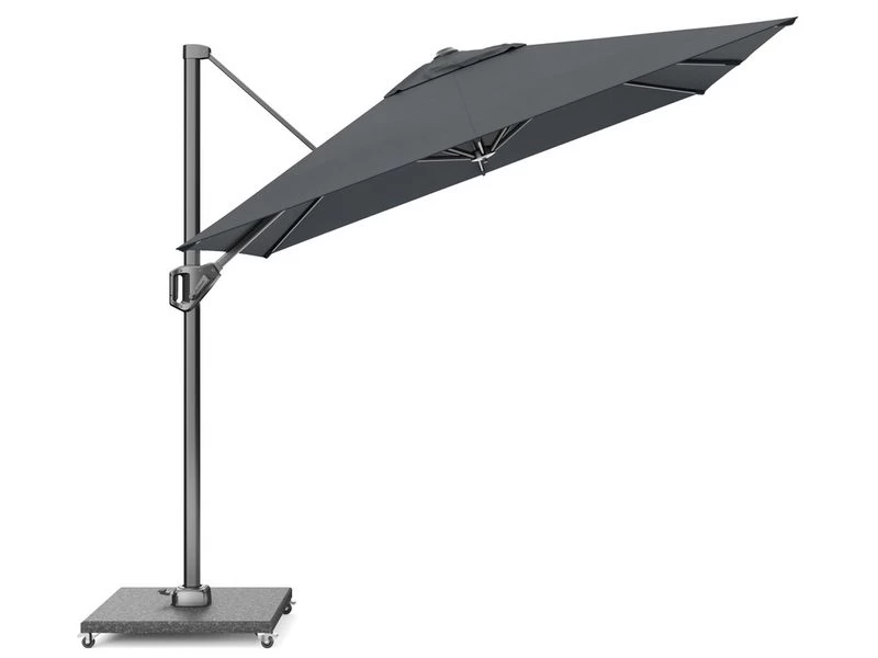 Zweefparasol Voyager T1 2,5 x 2,5 mtr. van Platinum. Achterwaarts kantelbaar en 360 graden draaibaar. De Voyager T1 zweefparasol is uitgevoerd met een 220 grams antraciet polyester doek voorzien van water- en vuilafstotende coating. Dit doek heeft een hoge mate van kleurechtheid is getest in klasse 5-6 (goed – zeer goed). Een zweefparasol heeft het grote voordeel dat de paal van de zweefparasol niet zo nadrukkelijk aanwezig is als bij een gewone parasol en wat verder van uw tuinset geplaatst kan worden. Hierdoor kan de gehele ruimte onder de zwevende parasol benut worden. Houd uw parasol als nieuw en dek deze alleen af met een AeroCover ademende parasolhoes wanneer u deze langere tijd niet gebruikt. Granietvoet op foto tegen meerprijs leverbaar. In plaats van deze zweefparasols te verzwaren met tegels kan deze ook rechtstreeks op een 90kg parasolvoet van Platinum geplaatst worden. Deze zijn met wielen leverbaar zodat de parasol makkelijk te verplaatsen is.