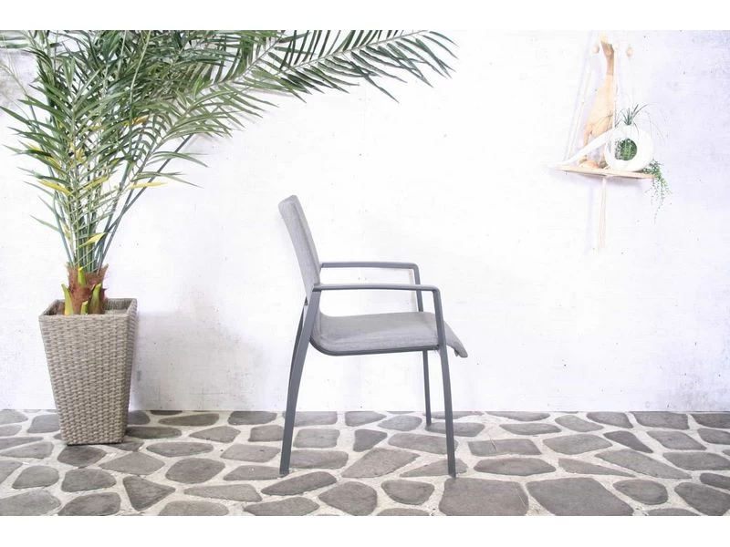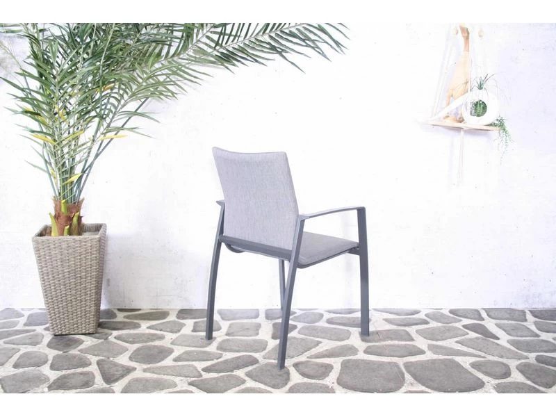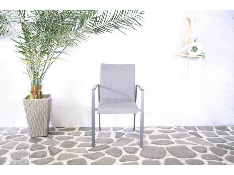 De Solero dining uit de collectie van Sens-line valt op door zijn outdoor textiel. De weerbestendige stof geeft uw terras een luxe en eigentijdse uitstraling. Het aluminium frame zorgt voor een vriendelijk gewicht. De grijstinten zorgen voor een stijlvolle look en zorgt ervoor dat de Solero met vele modellen tafels is te combineren.
