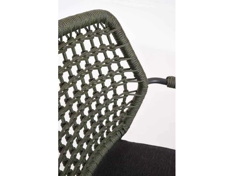 Deze stoel is uitgevoerd in de kleur groen. Het rope materiaal is weerbestendig en in een blok-patroon geknoopt. Het rope komt op subtiele wijze weer terug in de armleuningen.