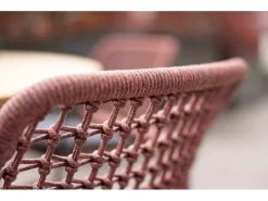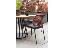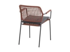 Deze stoel is uitgevoerd in de kleur terracotta. Het rope materiaal is weerbestendig en in een blok-patroon geknoopt. Het rope komt op subtiele wijze weer terug in de armleuningen.
