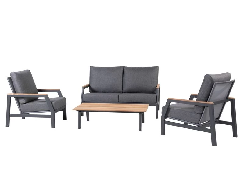 Taste by 4SO Ravenna 2 x lounge stoel + 1 x 2.5-zits lounge bank met antraciet aluminium frame en teak armleggers + ravenna salontafel.