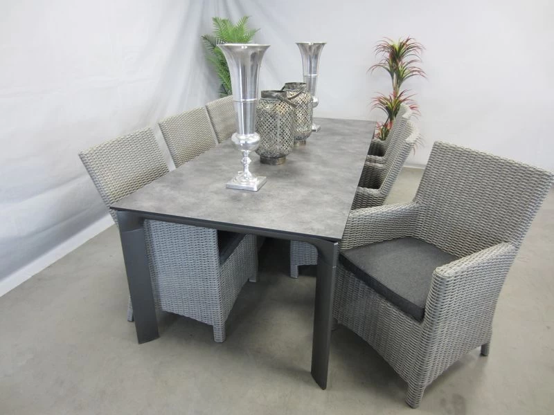 6 tuinstoelen met hpl tuintafel 220 x 95 cm.