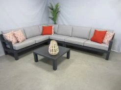 De Lauren hoek-lounge set is gemaakt van een aluminium frame. Het zitting gedeelte is voorzien van textileen, en het ruggedeelte is uitgevoerd met dikke aluminium buizen. De set heeft een stoere uitstraling. Deze lounge set wordt uiteraard geleverd inclusief vuil- en waterafstotende kussens. Deze hoek-lounge-set bestaat uit twee 2 2-zits lounge-banken, een corner, een centerdeel en een tafel. De totale afmeting van de set is 260 x 340 cm. De tafel heeft een afmeting van 83 x 83 x H 35 cm.