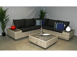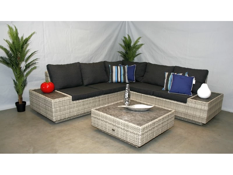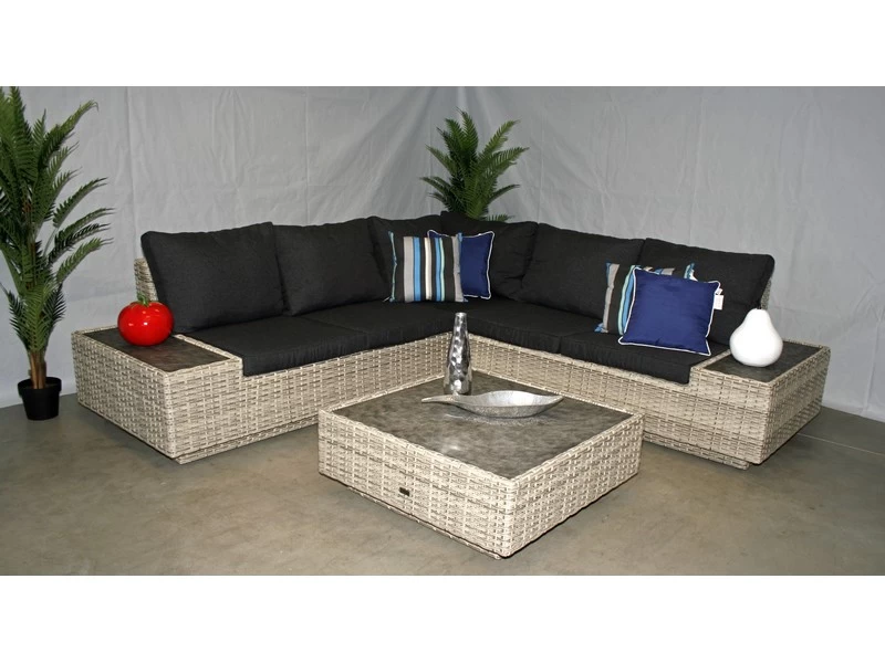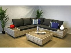 Het gebruik van eersteklas materialen (kunststof vlechtwerkdraad), een stevige en weersbestendige constructie (aluminium frame) en een eigentijds design, geven de Te Velde Nogaro hoek lounge set een modern uiterlijk en zorgen ervoor dat de set het hele jaar door buiten kan blijven staan. De strakke lijnen en speelse zijtafels maken deze loungeset een eyecatcher in iedere tuin.