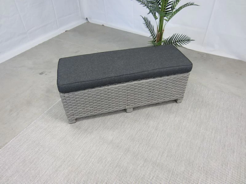 Dit handige 2-zits bankje is bij veel tuinsets combineerbaar. Het bankje is gemaakt van een aluminium frame met daar omheen een 10 mm – halfronde vlechtwerkdraad in de kleur blended grey. De bankje wordt uiteraard geleverd inclusief antracietkleurige kussen.
