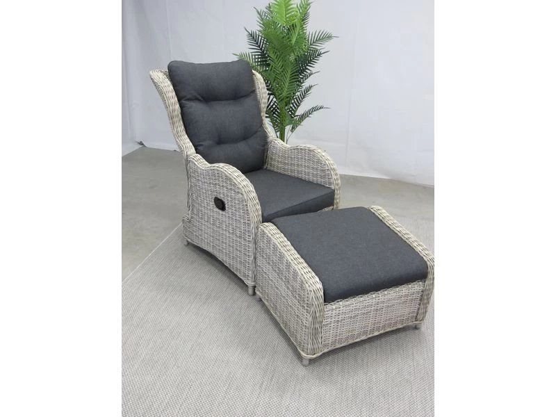 De Riverside gasveerverstelbare lounge stoel, is gemaakt van een aluminium frame met daar omheen een 6,5 mm halfrond vlechtwerkdraad in de kleur earl natural inclusief antracietkleurige zit- en rugkussens. Deze stoel wordt geleverd met voetenbank. Door de verstelling van de rug, kunt u altijd zitten op de door u gewenste manier.