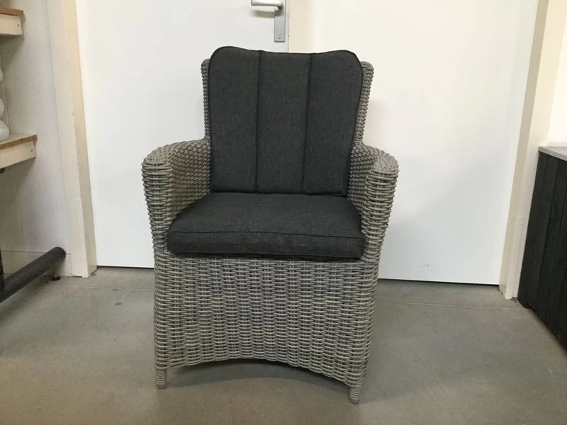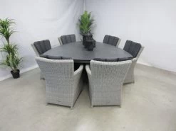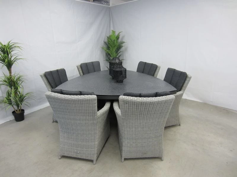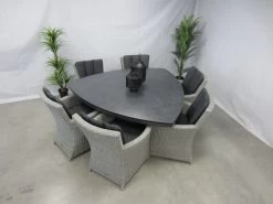 Unieke vorm van tuintafel, daardoor heeft deze set een sfeervolle uitstraling. Tafel heeft een aluminium frame en het blad is gemaakt van spraystone. Deze tuintafel heeft daardoor een natuurlijke uitstraling. De tuinstoel is gemaakt van een aluminium frame met een gevlochten draad van kunststof. Het kussen is door het polyester materiaal kleurecht en vuil en waterafstotend. Stoel wordt geleverd inclusief zit en rugkussens.