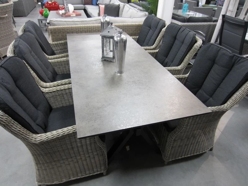 Unieke vorm van tuintafel, daardoor heeft deze set een sfeervolle uitstraling. Tafel heeft een aluminium onderstel, en het blad is gemaakt van een kunsstof materiaal, HPL. Deze tuintafel heeft daardoor een prachtige uitstraling. De tuinstoel is gemaakt van een aluminium frame met een gevlochten draad van kunststof. Het kussen is door het polyester materiaal kleurecht en vuil en waterafstotend.