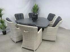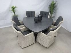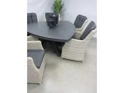 Unieke vorm van tuintafel, daardoor heeft deze set een sfeervolle uitstraling. Tafel heeft een aluminium frame en het blad is gemaakt van spraystone. Deze tuintafel heeft daardoor een natuurlijke uitstraling. De tuinstoel is gemaakt van een aluminium frame met een gevlochten draad van kunststof. Het kussen is door het polyester materiaal kleurecht en vuil en waterafstotend. Stoel wordt geleverd inclusief zit en rugkussens.