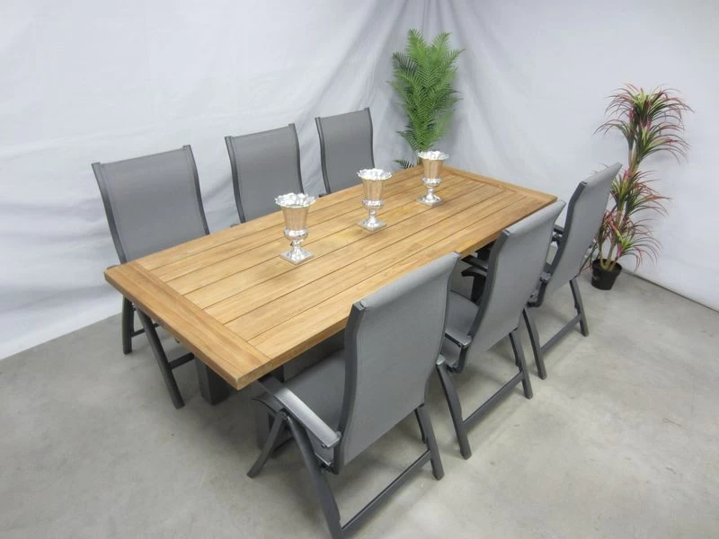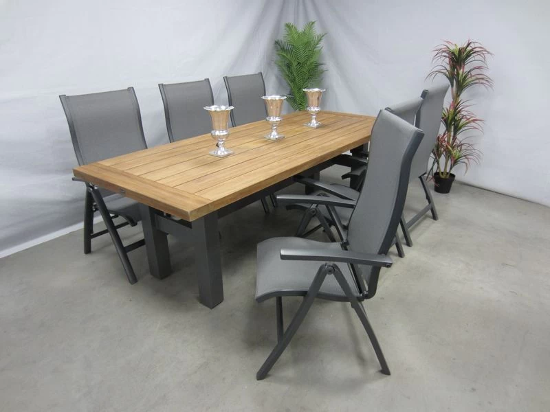 6 verstelbare tuinstoelen met teak tuintafel 240 x 100 cm.