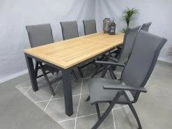 Mooi vormgegeven tuinstoel die bestaat uit een aluminium frame met een textilene doek. De rugleuning is rondom bekleed met textilene in tegenstelling tot alle andere modellen. De scharnierpunten zijn gemaakt van volledig aluminium. Extra stevig dus en een langere levensduur. Deze verstelbare tuinstoel is inklapbaar en voorzien van een duurzame coating in een donkere matt grey kleur. Deze kleur is eenvoudig te combineren met een tal van tuintafels. Natuursteen, aluminium, betonlook, het kan allemaal. De Palazzo teak-tuintafel heeft een Teak hout tafelblad en een aluminium frame dat een antraciet coating heeft. De tafel is 1 meter breed, 2,4 meter lang en 0,76 meter hoog.